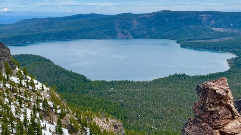 Reports about the trail to the top of Paulina Peak in Newberry Crater National Monument on June 1, 2024 stated that the last mile had a lot of snow. Rather than navigate through this and the abrupt steep drop off the last mile of the trail, hikers could elect to walk the road up to the peak. This road was not yet open for vehicles and had snow patches in the shady areas, but was very much passable by hikers. The last 1/2 mile to the peak on the road had three feet of compacted snow, but with the use of trekking poles, it was easily traversed. The views of the snow capped Cascades and Paulina Lake were splendid from the top as were eastern views toward Fort Rock and the Obsidian Flow. Hiking the road results in 1600 feet of elevation gain to the peak which is just under 8000 feet above sea level, but over a more gradual grade than the trail, making for a longer hike but more easily done. All in all, the total hike by the road is just under 8 miles up and back from the gate off the main road through the monument.