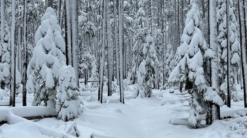 The path also steepens past the bridge and there was more accumulated snow. Central Oregon typically doesn't get a lot of snow early November, but 2024 was different with the snow depth on Peter Skene Ogden Trail over a foot at Paulina Falls. With more snow falling and the trees covered in a snow blanket, it was truly a winter wonderland with no other hikers seen. The entire hike up and back was just under twelve miles and over 1500 feet of elevation gain.