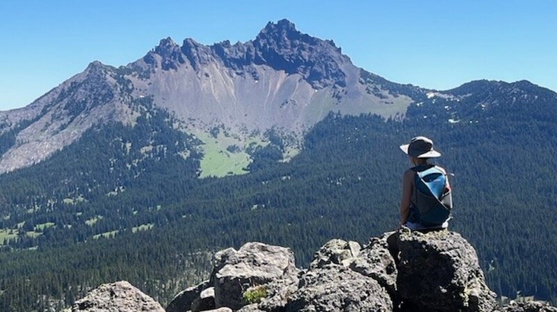While the higher Cascade Mountain hikes were still snow covered in mid July 2025, Maxwell Butte was snow free and offered spectacular mountain views. On July 12, only one other hiker was seen the entire day and while mosquitoes were a problem in the morning, they were gone once the sun rose. The hike from the trail head to the top of Maxwell Butte is a moderate, forested trek with 2453 feet of elevation gain over 5.10 miles one way; the last steep mile up the butte can be more challenging with switchbacks on pumice on parts of the path. However, the higher hikers get, the more the views of Mt. Washington, North and Middle Sister, The Husband and the Wife become visible until near the top, the full view of Tam McArthur Rim and Broken Top can also be seen. Hoodoo Ski Bowl and Hayrick Butte really stand out as well in the topography in a way that is not visible from lower elevations. Looking east, Three Fingered Jack dominates the skyline and north, fabulous views of Mt. Jefferson, Mt. Hood and the eight lakes basin are seen.