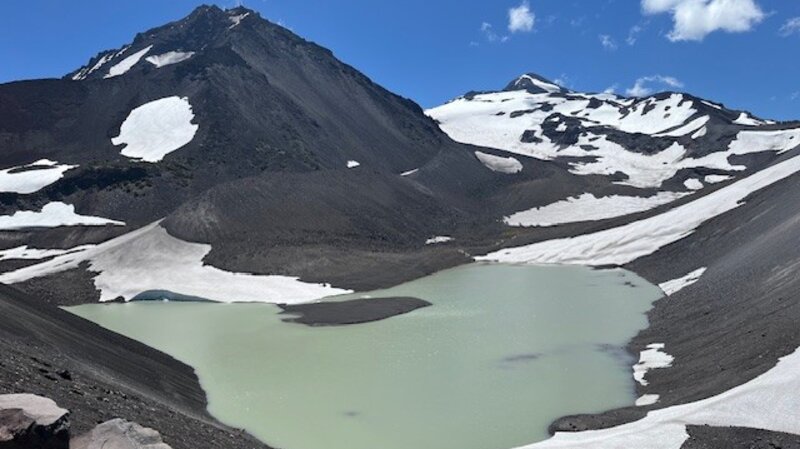 It is estimated that hundreds of thousands of people hike sections of the Pacific Crest Trail each year, but only a few hundred succeed in completing the entire 2650 +- miles. In Central Oregon, the PCT runs next to the Cascade Mountains, with sections on the east side and other sections on the west side of the seven prominent peaks. Collier cone is next to North Sister with Collier Glacier lying in the saddle between North and Middle Sister abutted on the west by Little Brother. Over the years the glacier has been in retreat with the greatest loss prior to 1950. The wet winter and cooler spring experienced in 2025 compared with 2023 appears to reflect more snow and more water in the glacial lake later in the summer.