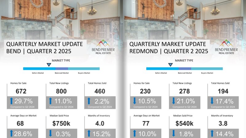 Click Here to see the Q2 Market Trends for Bend Real Estate and Redmond Real Estate, as well as the Q2 real estate trends in Sunriver, La Pine, Sisters, Prineville, Madras, Powell Butte, and Black Butte Ranch. In Q2 2025, the Bend Oregon Real Estate market and surrounding communities experienced a change, typically seeing a significant increase in inventory year over year with more homes, more new listings, and consistently more days on market. Buyers had more choices with the increased number of homes for sale and sellers were more inclined to consider offers under asking price. The number of listings grew, days on market increased in many markets, and prices decreased slightly in the larger markets of Bend and Redmond. However, despite the increased number of homes for sale, Bend, Redmond, Sisters, Prineville and Madras reflected a seller's market, although much less strong than in earlier quarters; Black Butte Ranch, La Pine and Sunriver were in a balanced market with Powell Butte in a very strong buyer's market with 32 months of supply.